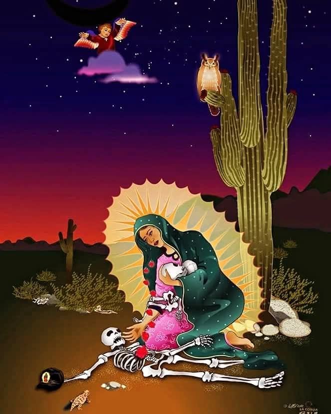 Nuestra Señora, Tonantzin Guadalupe, es el entramado secreto que une las tierras mas allá de los océanos. El hilo antiguo que cose continentes, memorias, dolores, lenguas, pueblos, heridas. Lo mismo toca la arena del desierto que las aguas profundas, lo mismo habita el maíz que el incienso, reza con los labios de una abuela y también grita con la garganta de una madre buscadora. Ella no divide credos: los atraviesa. No disputa doctrinas: las trasciende.
